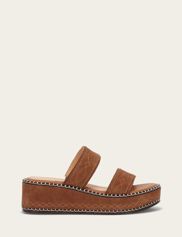 The Joy Woodstock 2 Band sandal is crafted with your choice of the finest suedes and leathers, complemented by a jute wrap detail. The stitching detail on the upper showcases a modern twist on the brand's classic heritage stitching. Featuring a new wedge construction and decorative arrow stitching, this slip-on offers a platform height of 1.375 inches and a heel height of 2 inches for that perfect lift.